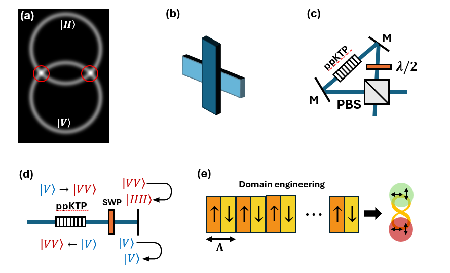 An alternative approach [7] is to move this complexity inside the nonlinear medium itself (Fig. 1e). By choosing the periodic poling and phase-matching conditions appropriately, a single ppKTP crystal can support both SPDC processes in a single pass, avoiding external interferometers. In a recent collaboration involving Raicol crystals, Shukhin and co-workers improve on this, using a domain-engineered KTP crystal to generate polarization entanglement, and at the same time shape the joint spectral intensity (JSI) [8].